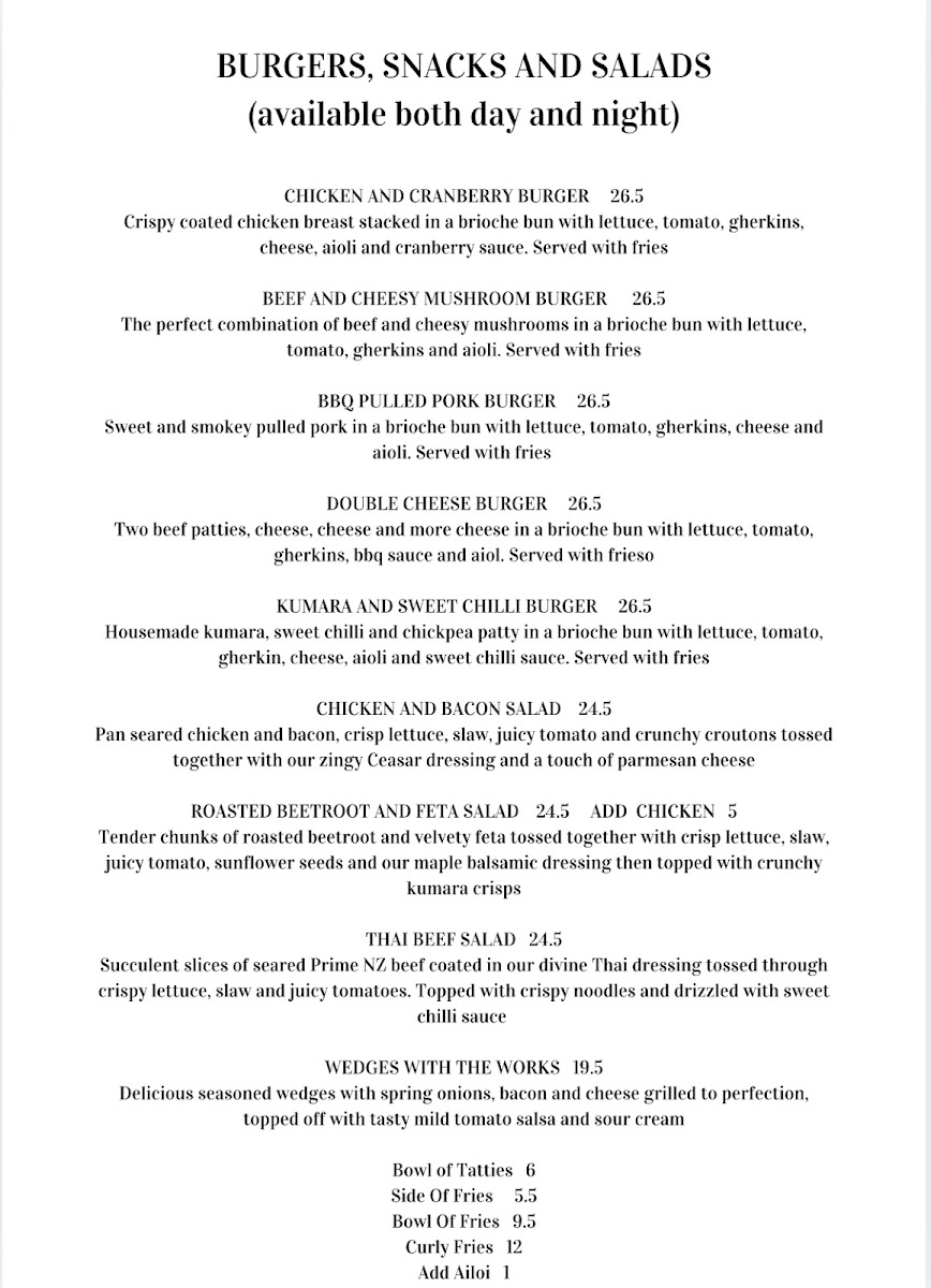 Burgers, snacks, and salads feature various burger options including Chicken and Cranberry, Beef and Cheesy Mushroom, BBQ Pulled Pork, Double Cheese, and Kumara with Sweet Chilli. Salads offered include Chicken and Bacon, Roasted Beetroot and Feta, and Thai Beef, alongside a side of Wedges with The Works.