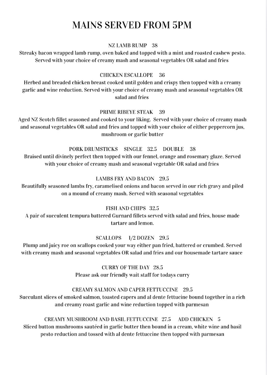 Starters include choices such as Garlic Ciabatta, Seafood Chowder, Soup of the Day, House Made Onion Rings, Nobashi Prawns, and Tatties. These items provide a range of light beginnings or small plates suitable for sharing or starting a meal.