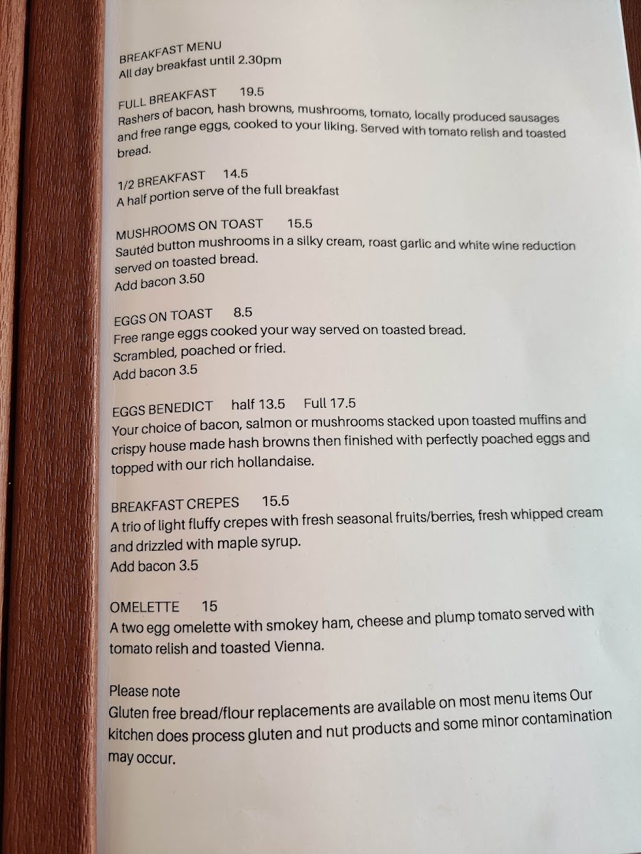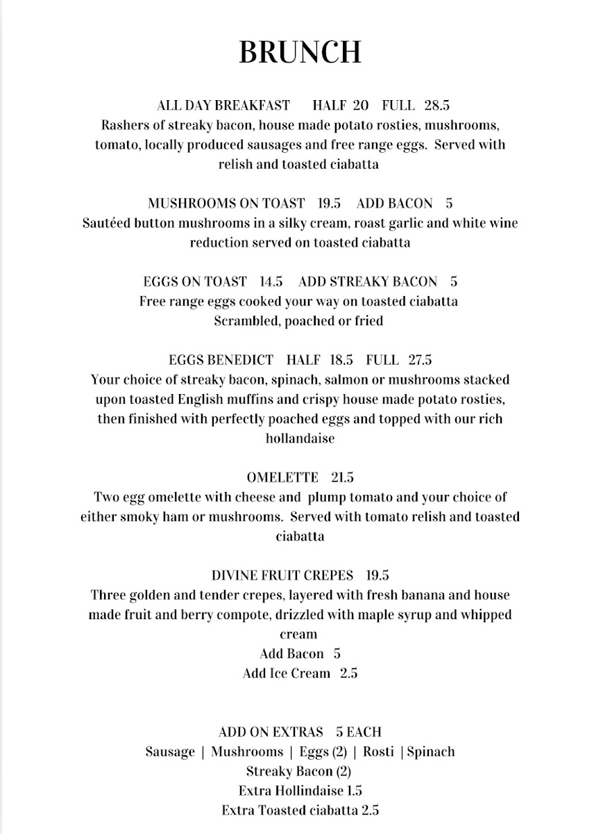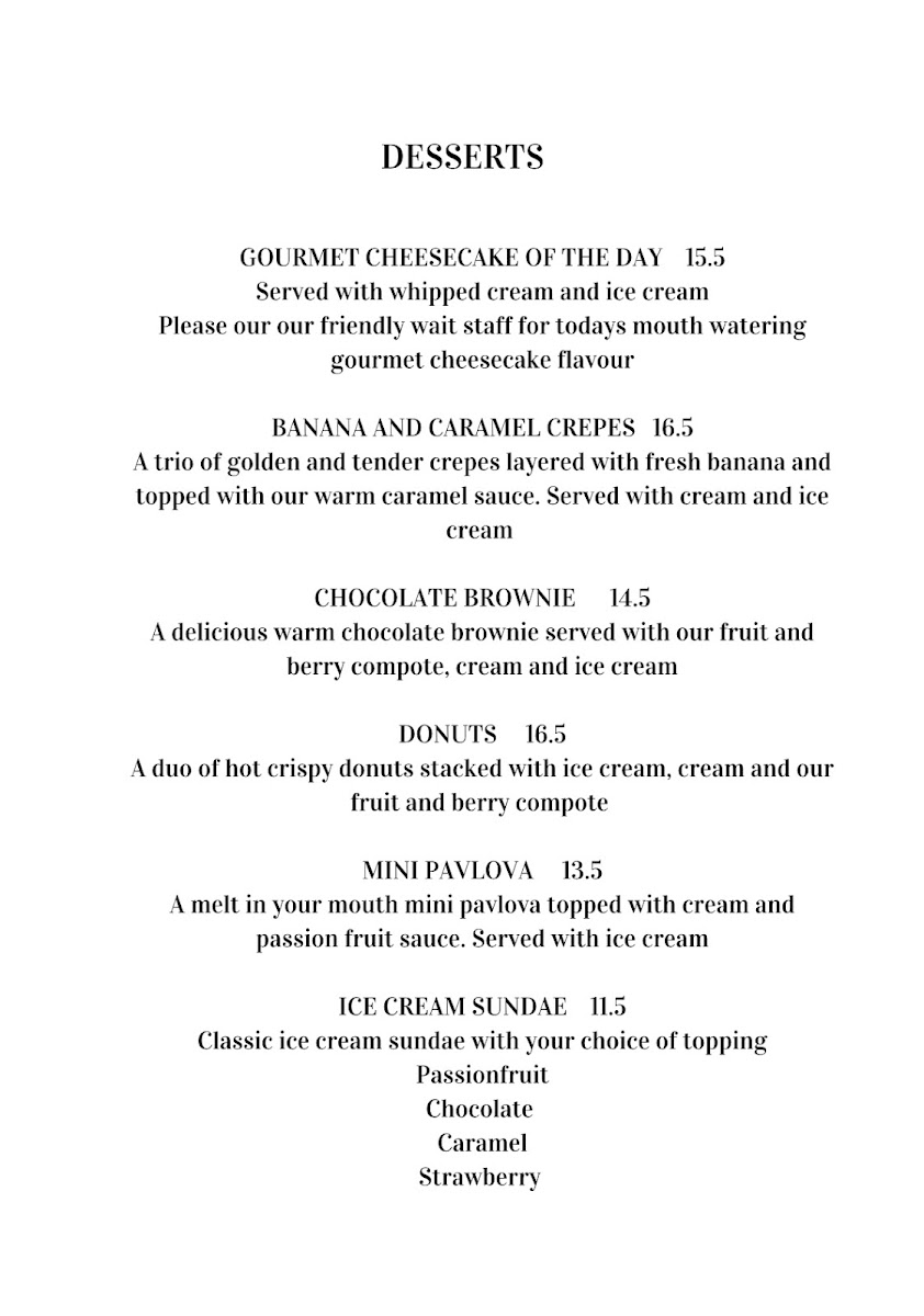 Desserts include selections such as the Gourmet Cheesecake of the Day, Banana and Caramel Crepes, Chocolate Brownie, Donuts, Mini Pavlova, and Ice Cream Sundae, providing a range of sweet choices to finish a meal.